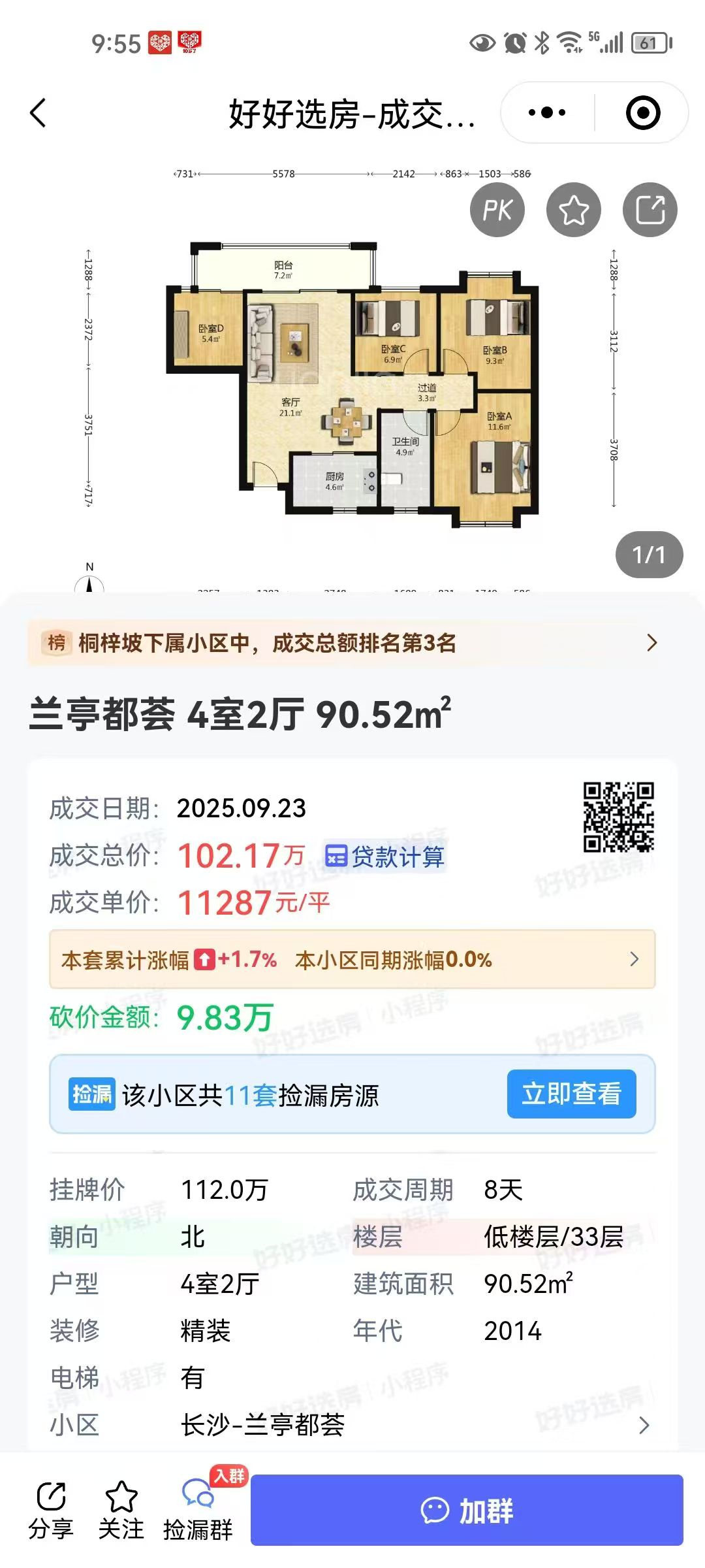 璟峰苑(蘭亭都薈),湘雅附三旁,90.52平,南北通透邊戶,4房(送了一間房),精裝修的,71.2萬拍的,單價(jià)7800一平,二手房同戶型9月份成交是102萬,穩(wěn)撿漏。